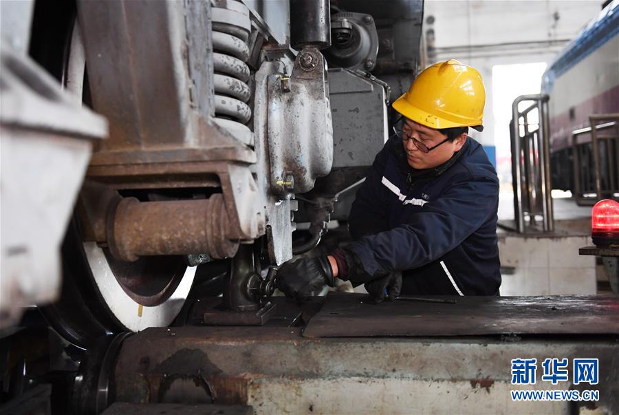 2月21日,机车镟轮工朱永强在西安机务段检修车间用千斤顶对车轮进行定位加固。新华社记者李一博摄