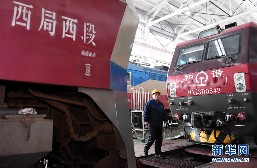 2月21日,机车镟轮工张杰从西安机务段检修车间停放的机车前走过。新华社记者李一博摄