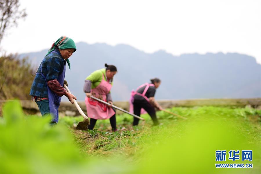 2月22日,在贵州省黔东南苗族侗族自治州丹寨县排调镇也改村蔬菜种植基地,村民对西兰花进行管护。 新华社发(杨武魁 摄)