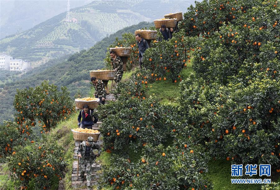 2月22日,湖北省宜昌市秭归县郭家坝镇王家岭村村民在田间转运脐橙。 新华社发(郑家裕 摄)