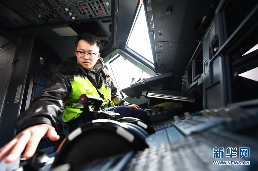 2月22日,机务人员陈赫在飞机驾驶室内检查。 新华社记者陈斌摄