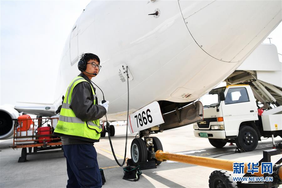 2月22日,机务人员滑翔在停机坪对一架飞机进行起飞前检查工作。 新华社记者陈斌摄