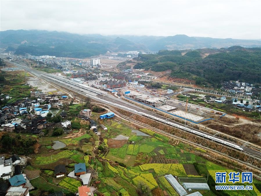 2月23日,一列列车在贵广高铁贵州从江段行驶(无人机拍摄)。 早春时节,贵州省黔东南苗族侗族自治州境内的油菜花陆续盛开,列车穿行其间,美不胜收。 新华社记者 杨文斌 摄