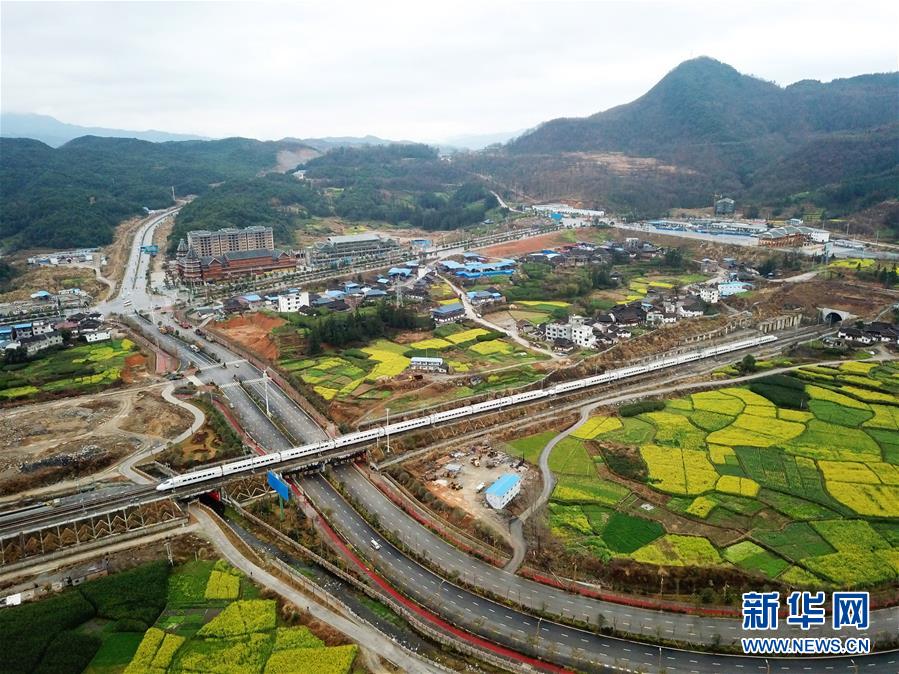 2月23日,一列列车在贵广高铁贵州从江段行驶(无人机拍摄)。 早春时节,贵州省黔东南苗族侗族自治州境内的油菜花陆续盛开,列车穿行其间,美不胜收。 新华社记者 杨文斌 摄