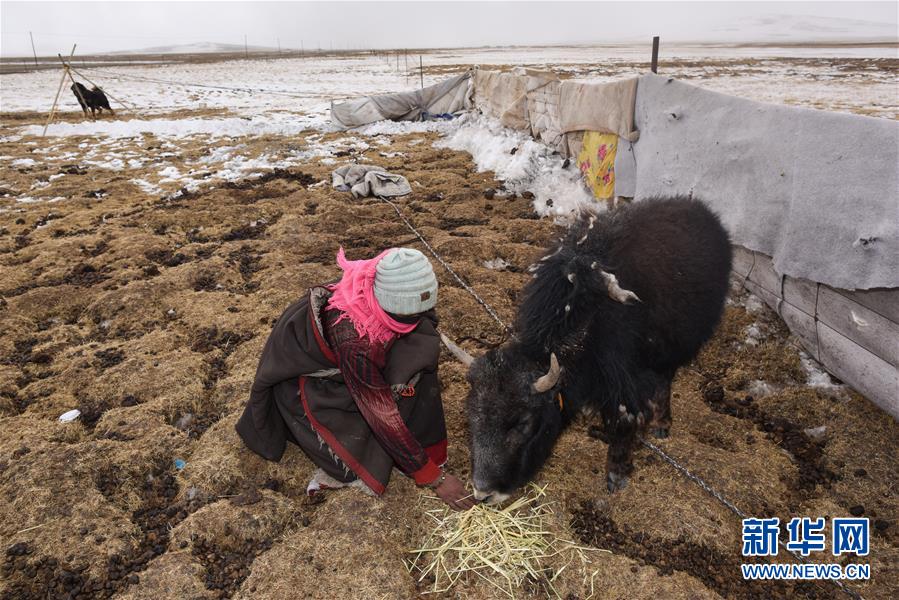 2月22日,一名转场过来的藏族妇女在麦雄滩上给牛喂饲草料。新华社记者 吴刚 摄