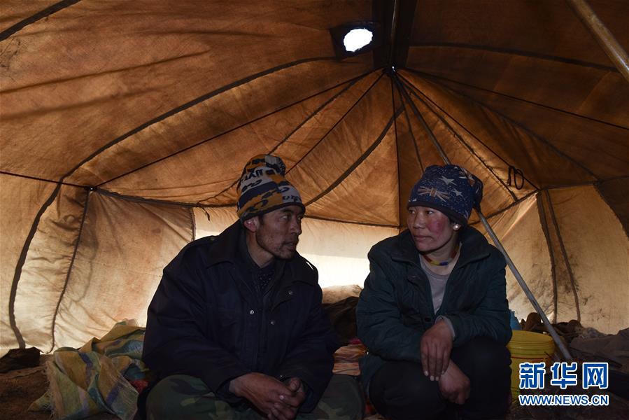 2月22日,查周和妻子在麦雄滩的帐篷内聊天。新华社记者 吴刚摄