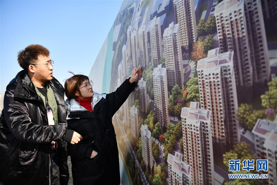 在天津市东丽区一楼盘的施工围挡前,张世玉(右)和吕新正欣喜地查看自家婚房的位置(2月1日摄)。 新华社记者 李然 摄
