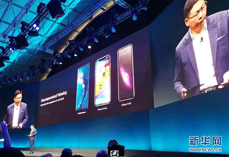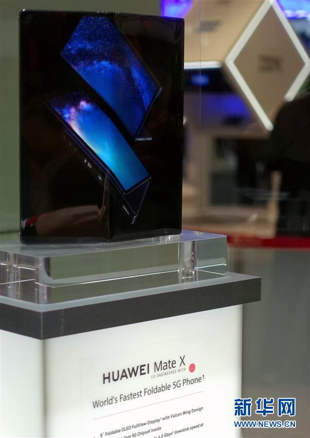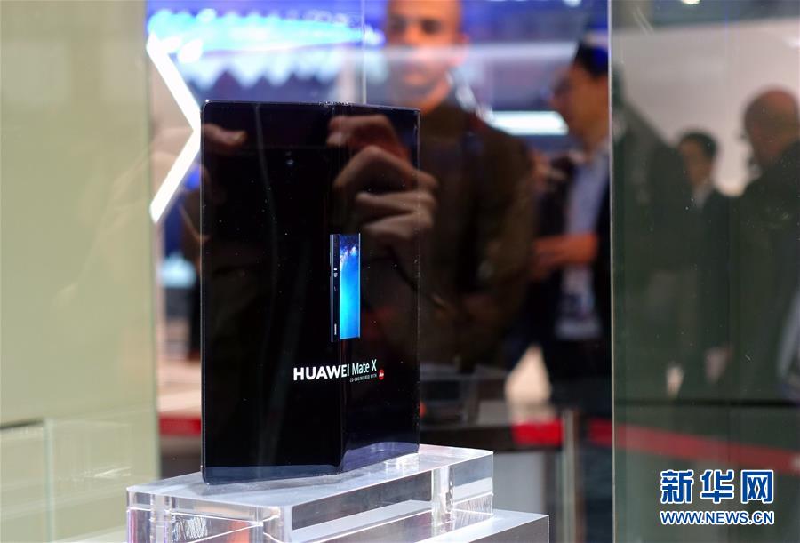 这是2月25日在西班牙巴塞罗那世界移动通信大会上拍摄的华为Mate X手机。 华为公司24日在西班牙巴塞罗那举行产品发布会,首次推出基于第五代移动通信技术(5G)的商用手机Mate X。这款智能手机采用折叠屏设计,其搭载的多模5G芯片被誉为“华为最强”。 新华社记者郭求达摄