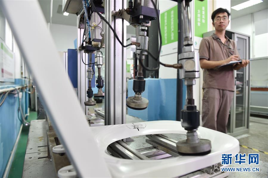 在位于福建省南安市的九牧卫浴,技术人员记录智能马桶盖扭力测试数据(2016年5月10日摄)。 新华社记者 宋为伟摄