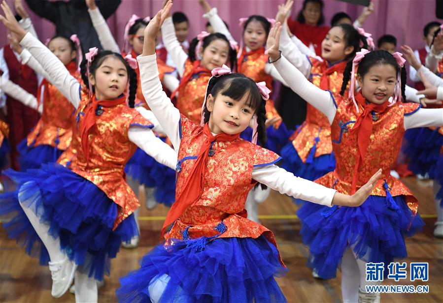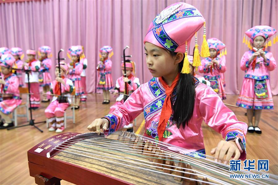 2月25日,身着壮族服饰的孩子们在南宁市玉兰路小学开学典礼上用传统乐器演奏《欢乐颂》。 当日,广西南宁市中小学正式开学上课。 新华社记者 周华 摄