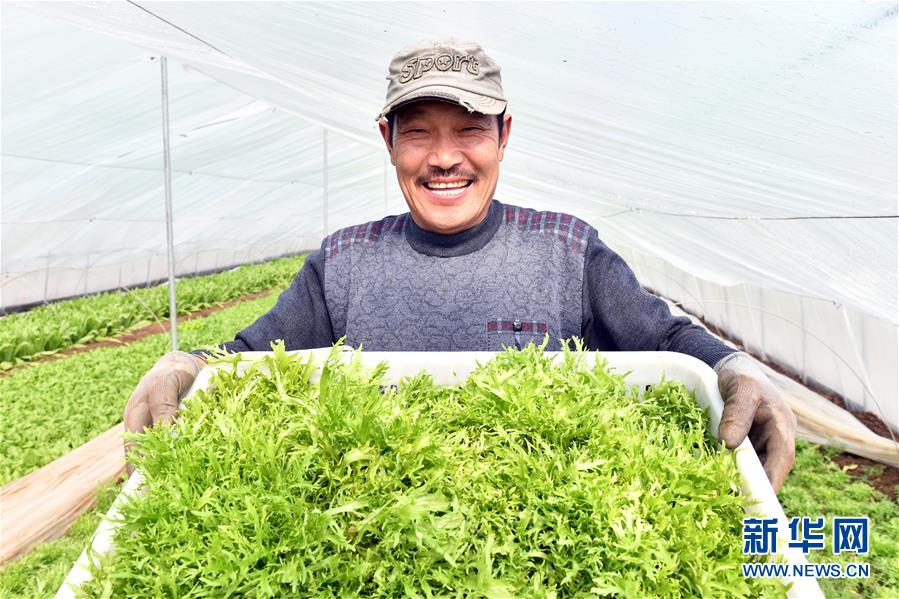 在山东潍坊市寒亭区中百大厨房的冯马杨孟村蔬菜种植基地,62岁的土地流转户冯佃岗在此打工,月收入三千多元(2月16日摄)。 新华社记者 郭绪雷 摄