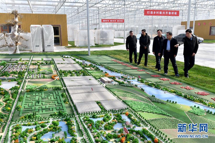 在山东潍坊市寒亭区前阙庄村,当地干部在沙盘前查看东篱田园综合体核心区建设推进情况(2月16日摄)。 新华社记者 郭绪雷 摄