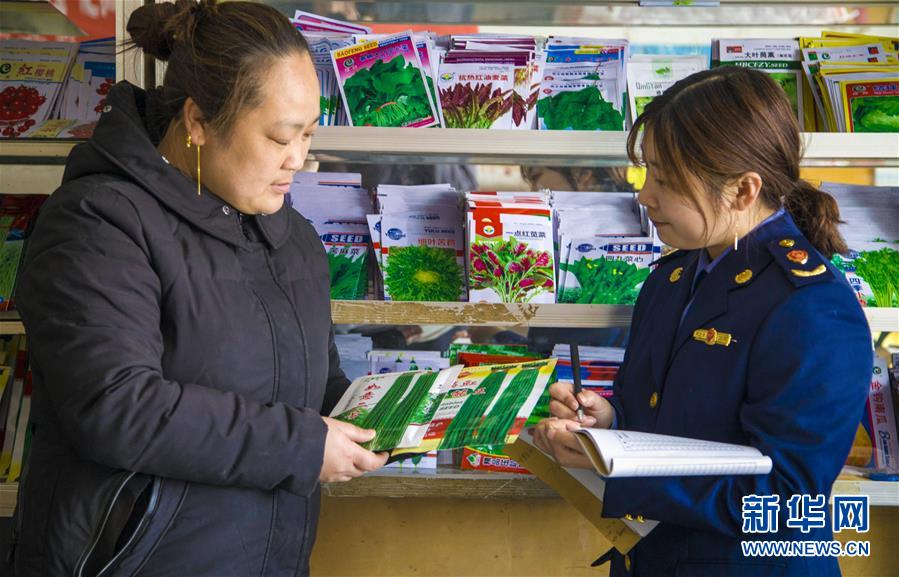 2月27日,河北永清县市场监督管理局工作人员在检查店铺销售的蔬菜种子。近日,河北省永清县市场监督管理局开展农资打假“红盾行动”,对全县农资、农具的销售、储存、生产等环节进行检查,打击坑农害农行为,为春耕备耕保驾护航。 新华社记者 李晓果 摄