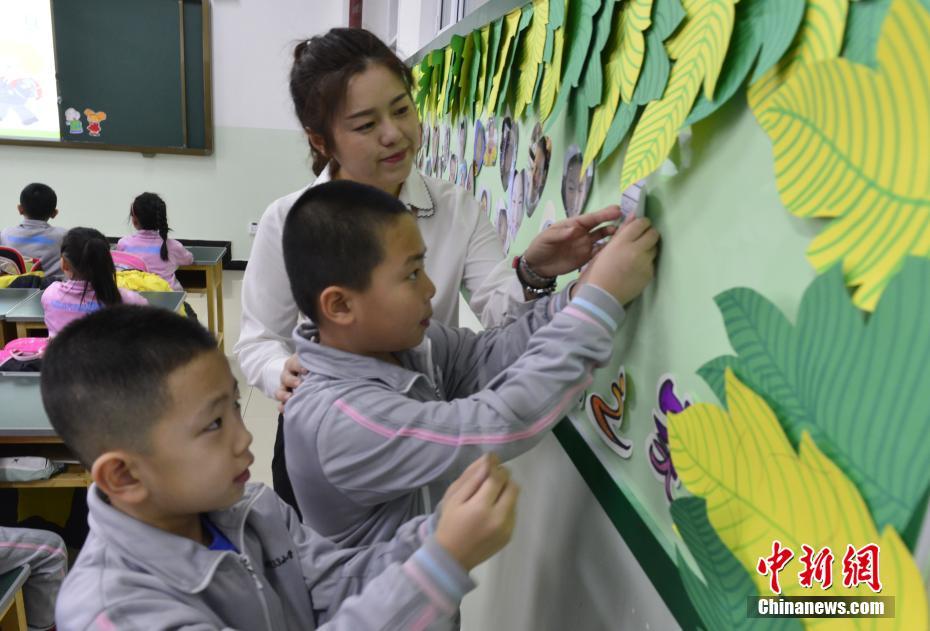 2月27日,新疆乌鲁木齐市第133小学,一年级的学生在老师的指导下将自己的照片贴上笑脸墙。当天,该市52万名中小学生结束假期生活,走进课堂开始新学期第一天的课程。中新社记者 刘新 摄