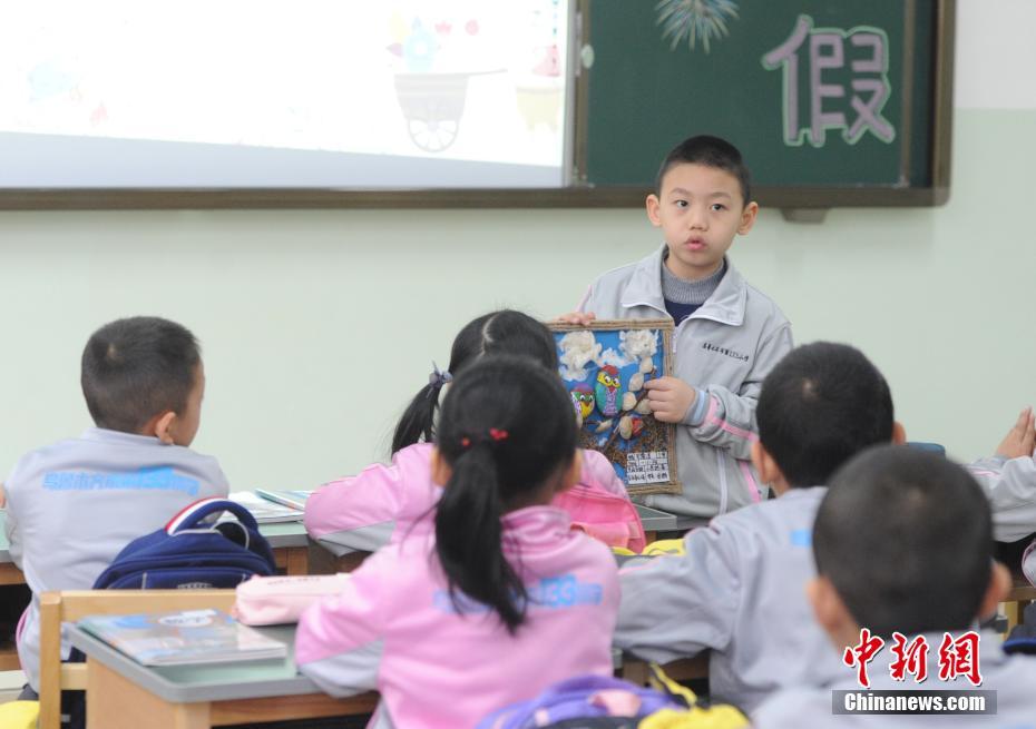 2月27日,新疆乌鲁木齐市第133小学,一名一年级的学生向同学们展示假期制作的手工制品。当天,该市52万名中小学生结束假期生活,走进课堂开始新学期第一天的课程。中新社记者 刘新 摄