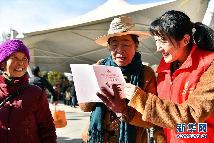 2月27日,城关区妇联工作人员向市民发放反家庭暴力法宣传材料。 当日,拉萨市城关区2019年“四讲四爱”群众教育实践活动脱贫攻坚示范宣讲暨“五下乡·四进社区”集中宣传服务活动启动。 新华社记者 李鑫 摄