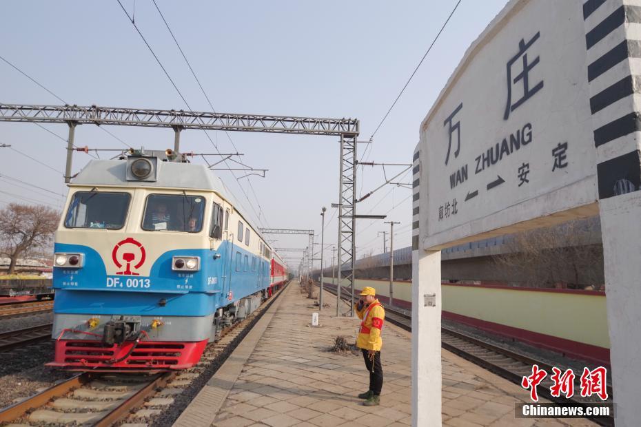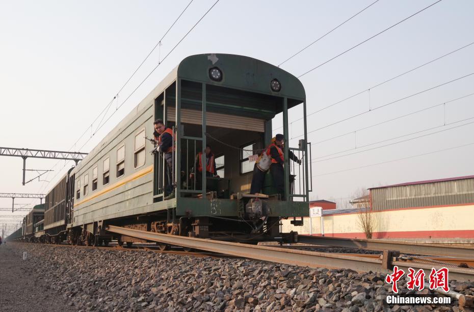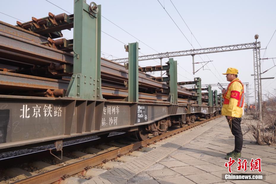 2月27日,春运临近尾声,中国铁路北京局集团有限公司工电大修段在京沪线廊坊地区开始运卸长钢轨作业,为3月份此区间段换轨大修做准备。图为运送长钢轨专用列车驶入万庄站。中新社记者 贾天勇 摄