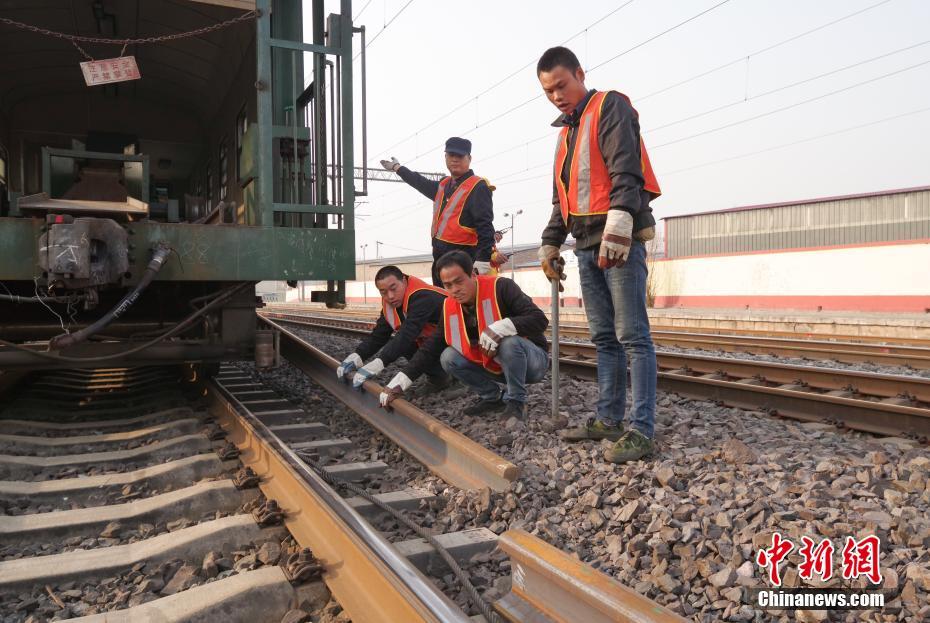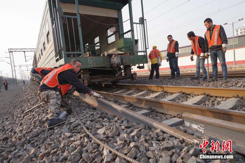 2月27日,春运临近尾声,中国铁路北京局集团有限公司工电大修段在京沪线廊坊地区开始运卸长钢轨作业,为3月份此区间段换轨大修做准备。图为工人运卸钢轨。中新社记者 贾天勇 摄