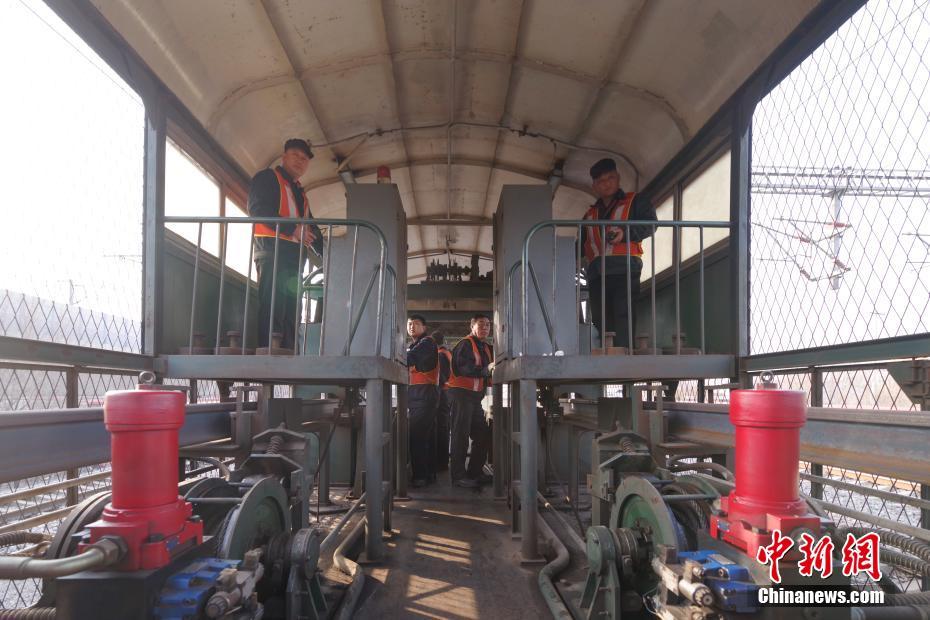 2月27日,春运临近尾声,中国铁路北京局集团有限公司工电大修段在京沪线廊坊地区开始运卸长钢轨作业,为3月份此区间段换轨大修做准备。图为工人在列车上操作卷扬机卸钢轨。中新社记者 贾天勇 摄