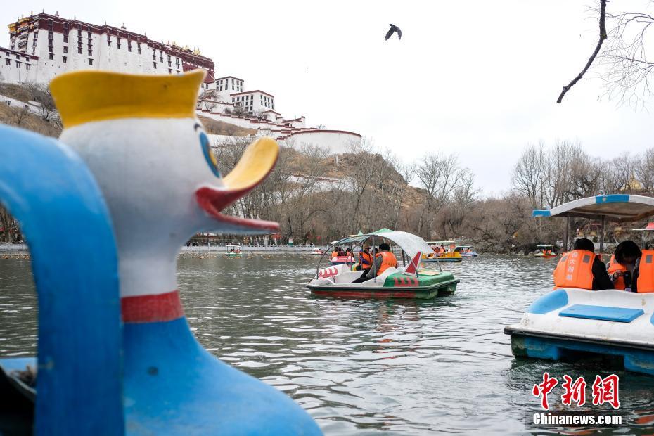 2月27日,市民及游客在拉萨宗角禄康公园划船游玩,享受春日时光。随着春天的到来,位于布达拉宫脚下的宗角禄康公园湖面冰雪消融,湖面上游船、水鸟、古树、寺庙相映成趣,吸引当地民众前往踏春游玩。中新社记者 何蓬磊 摄