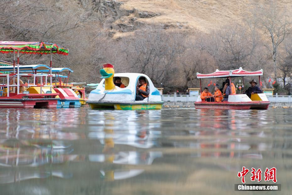 2月27日,市民及游客在拉萨宗角禄康公园划船游玩,享受春日时光。随着春天的到来,位于布达拉宫脚下的宗角禄康公园湖面冰雪消融,湖面上游船、水鸟、古树、寺庙相映成趣,吸引当地民众前往踏春游玩。中新社记者 何蓬磊 摄