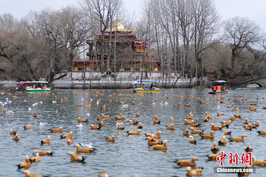 2月27日,市民及游客在拉萨宗角禄康公园划船游玩,享受春日时光。随着春天的到来,位于布达拉宫脚下的宗角禄康公园湖面冰雪消融,湖面上游船、水鸟、古树、寺庙相映成趣,吸引当地民众前往踏春游玩。中新社记者 何蓬磊 摄