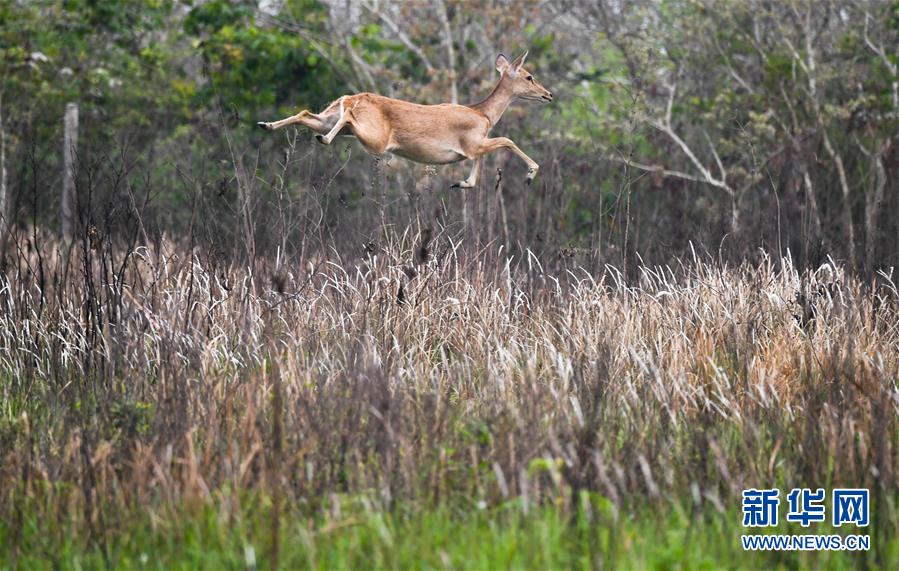 在海南大田坡鹿自然保护区内,一只坡鹿飞跃草丛(2018年4月3日摄)。国家一级保护动物海南坡鹿是特产于海南岛的热带珍稀鹿种,20世纪曾濒临灭绝。近年来,当地通过多种方式开展保护。现在,海南坡鹿数量逐渐增多、种群逐渐稳定,成为海南绿色生态的一张名片。 新华社记者 杨冠宇 摄