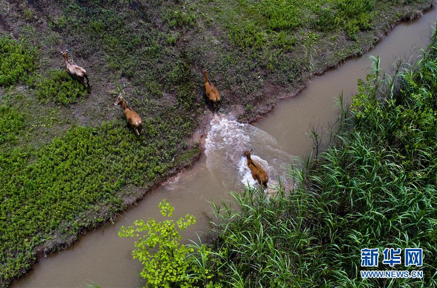 一群被救助的麋鹿奔跑在洞庭湖麋鹿和鸟类救护避难所内(2018年5月23日无人机拍摄)。麋鹿是我国特有物种、世界珍稀动物,曾一度在中国消失。如今,在洞庭湖湿地深处,一批“麋鹿奶爸”从为小麋鹿喂奶、担任“铲屎官”做起,呵护着麋鹿种群不断繁衍壮大。 新华社记者 李尕 摄
