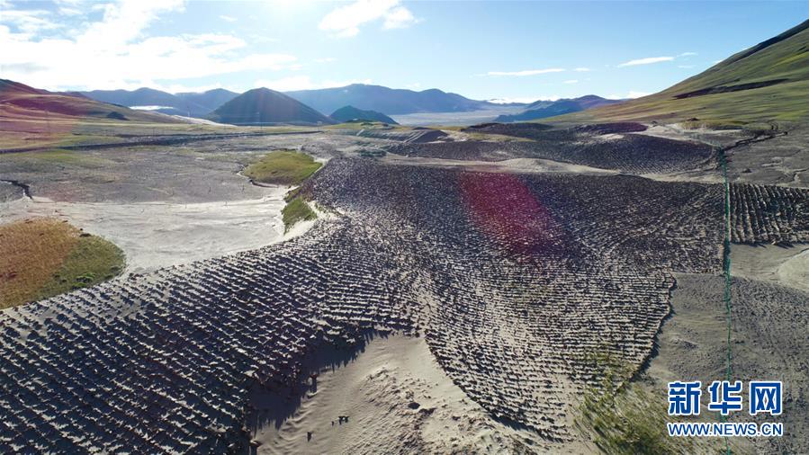 西藏日喀则市仲巴县境内雅鲁藏布江发源地附近被固化的沙丘(2018年9月8日无人机拍摄)。近年来,针对雅鲁藏布江生态环境现状,西藏自治区制订实施了全方位生态保护规划,在源头建立生态功能保护区,采取“人工种草”“退牧还草”等多种有效措施,增加和保护上游植被,防治沙化,成效显著。 新华社记者 普布扎西 摄
