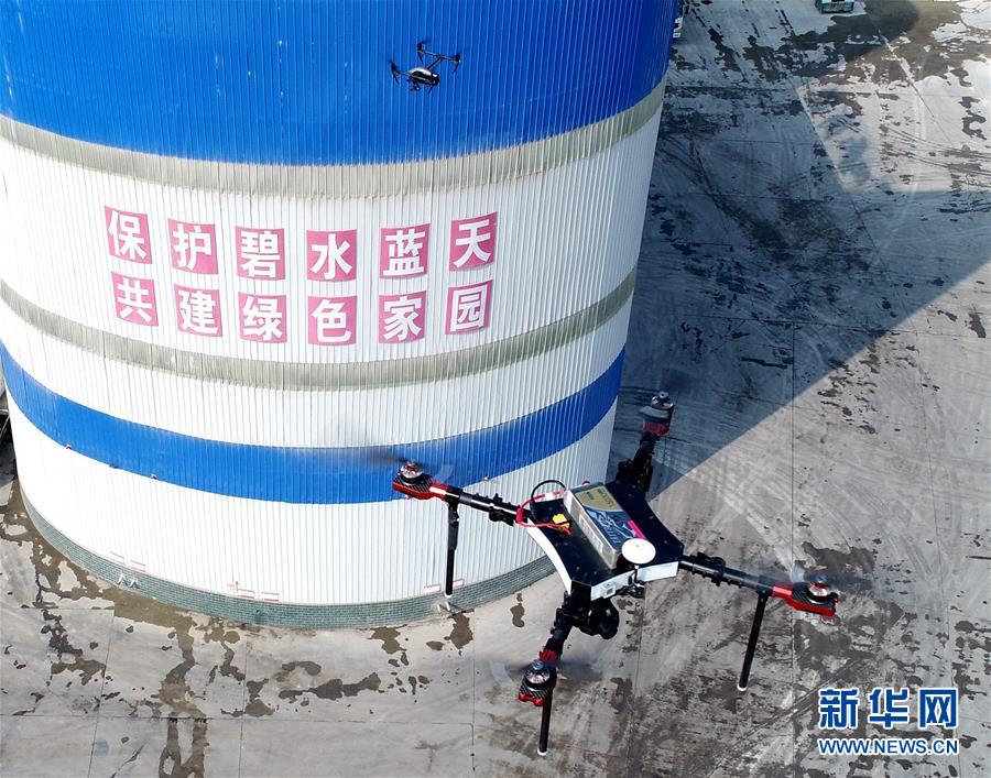 河北省邯郸市环保局魏县分局无人机在魏县一家企业监测空气质量指数(2018年11月1日无人机拍摄)。 新华社记者 王晓 摄