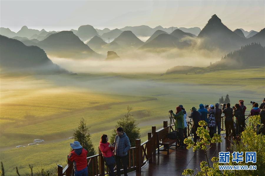 2月19日,游人在云南省罗平县金鸡峰丛拍摄油菜花田日出景色。 新华社记者 秦晴 摄