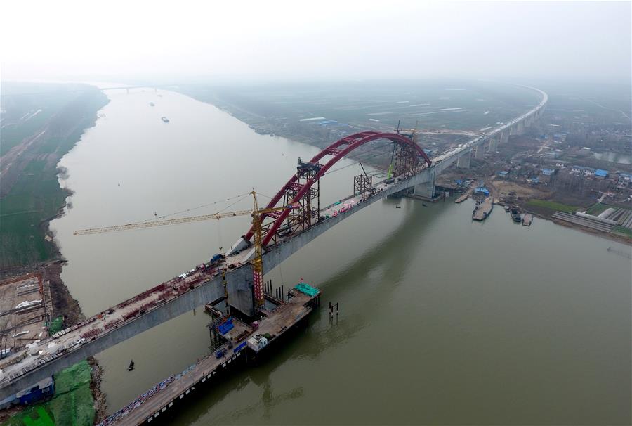 这是完成钢管拱提升合龙后的商合杭铁路跨淮河特大桥(2月28日无人机拍摄)。 2月28日,由中铁八局一公司承建的商合杭铁路跨淮河特大桥钢管拱顺利提升合龙。据了解,本次合龙的钢管拱,拱跨度为220米,矢高为44米,采用大节段原位整体同步提升的方式进行吊装,整个钢管拱同步提升起吊重量约为800吨,提升高度约为26.53米。 商合杭铁路由河南商丘站引出,途经安徽亳州、阜阳、合肥等地区,在芜湖跨越长江,引入杭州站,线路全长794.55公里,设计时速350公里。 新华社发
