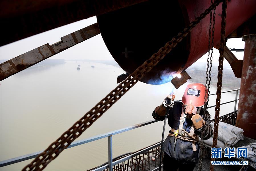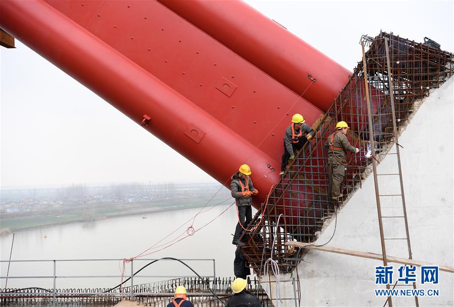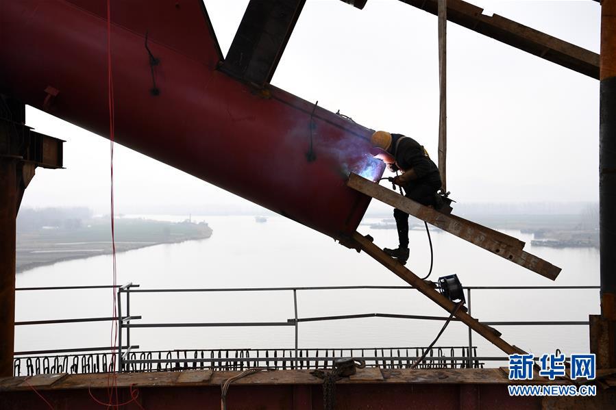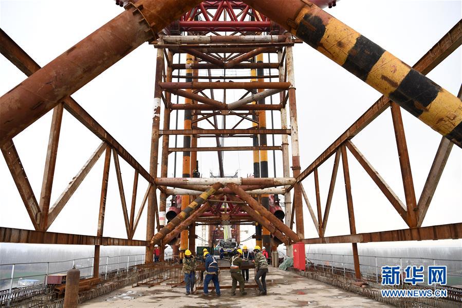 2月27日,施工人员为商合杭铁路跨淮河特大桥钢管拱提升合龙做施工准备。 2月28日,由中铁八局一公司承建的商合杭铁路跨淮河特大桥钢管拱顺利提升合龙。据了解,本次合龙的钢管拱,拱跨度为220米,矢高为44米,采用大节段原位整体同步提升的方式进行吊装,整个钢管拱同步提升起吊重量约为800吨,提升高度约为26.53米。 商合杭铁路由河南商丘站引出,途经安徽亳州、阜阳、合肥等地区,在芜湖跨越长江,引入杭州站,线路全长794.55公里,设计时速350公里。 新华社记者刘军喜摄