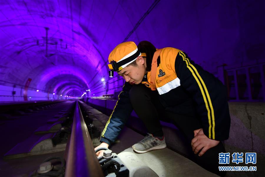 2月28日凌晨,西安工务段鄠邑线路车间高铁线路工何栋科在清凉山隧道里对西成高铁钢轨无缝线路位移进行观测检查。 新华社记者 李一博 摄