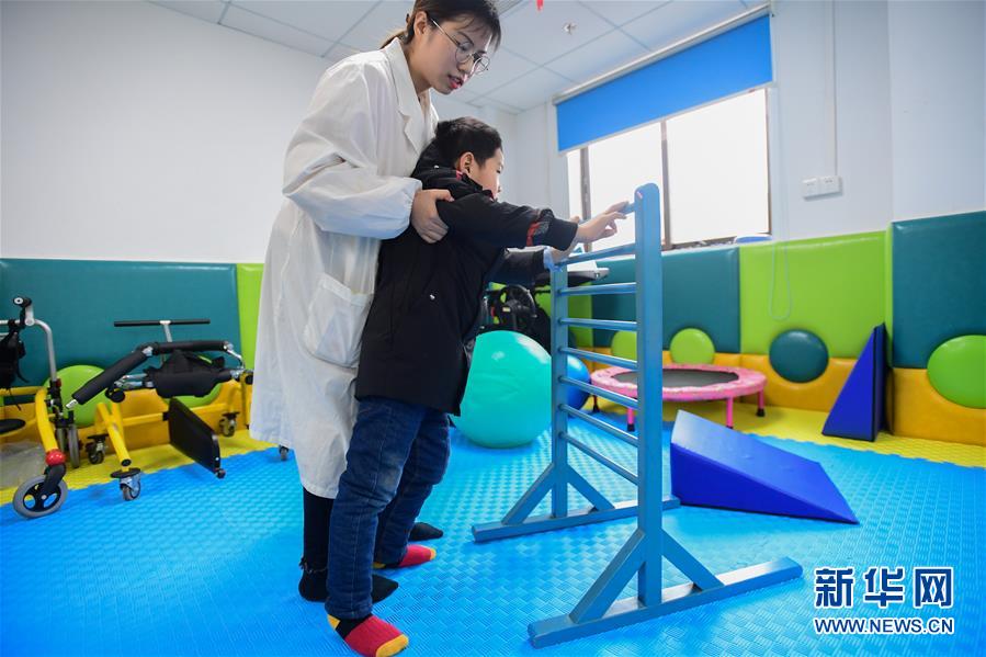 3月1日,在湖南中医药大学第一附属医院,康复治疗师曾祥英(左)在引导7岁脑瘫患儿昊昊(化名)进行行走康复训练。 新华社发(陈泽国 摄)