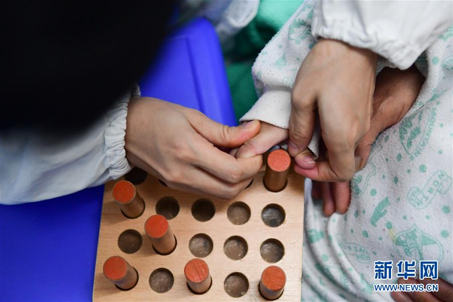 3月1日,在湖南中医药大学第一附属医院,康复治疗师方雪霞在协助7岁脑瘫患儿芸芸(化名)进行手部握持康复训练。 新华社发(陈泽国 摄)