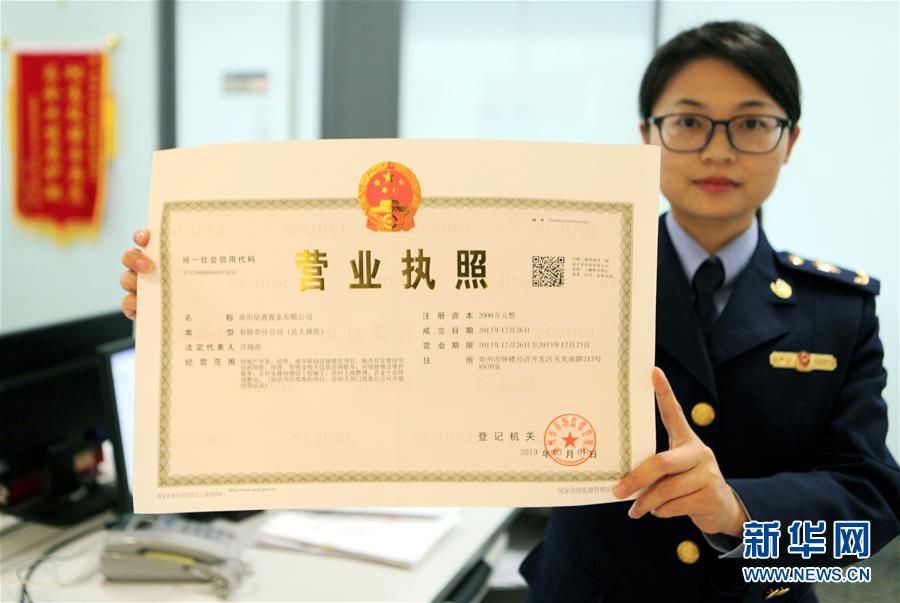 3月1日,江苏常州市市场监督管理局工作人员在展示新版营业执照。从3月1日起,全国市场监管部门将为准予设立登记、变更登记以及补发营业执照的各类市场主体,统一颁发新版营业执照。 新华社发(王启明 摄)