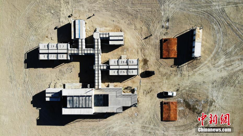 3月1日晚,冷湖“火星营地”开营仪式暨火星营地研学之旅在青海省海西州茫崖市冷湖地区举行,标志着中国首个火星模拟基地建成投运。“火星营地”占地面积约80亩,可同时容纳60人睡眠舱住宿,100人帐篷住宿。图为“火星营地”的“总部大楼”。中新社记者 孙睿 摄