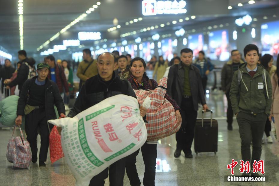 3月1日,重庆火车西站,旅客脚步匆匆。当日,为期40天的中国春运结束。中国交通运输部3月1日披露,预计春运40天(1月21日-3月1日),全国铁路、道路、水路、民航累计发送旅客29.8亿人次,与去年基本持平。中新社记者 陈超 摄
