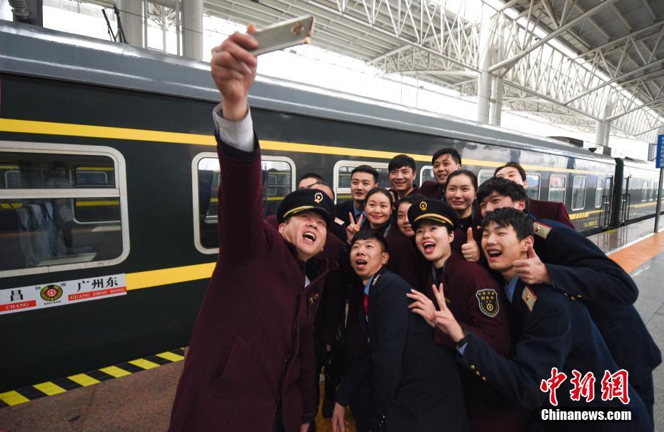 3月1日,由南昌客运段担当值乘的广州东终到南昌的K442次列车乘务员,在完成春运任务后在站台上自拍留念。鲍赣生 摄