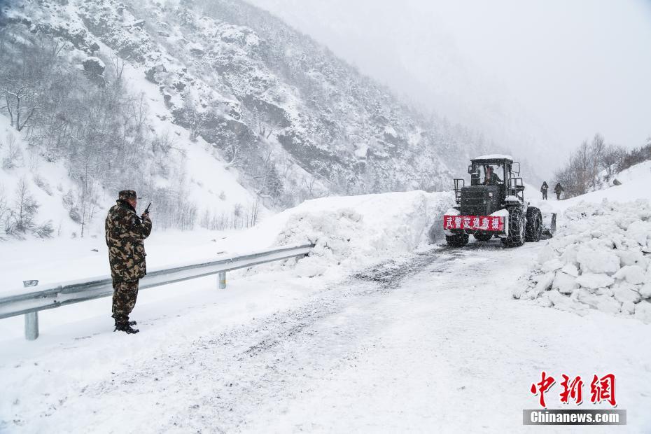 3月1日,经驻藏武警某部交通三支队养护四大队官兵连续9小时奋战,因雪崩受阻的国道318线西藏波密县玉普乡境内多处路段已成功抢通,并恢复通行。图为武警某部交通三支队官兵正在进行抢通作业。中新社发 穆显伟 摄