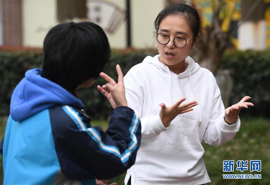 3月4日,在南京市聋人学校,于晓岚在操场上跟学生谈心。新华社记者季春鹏摄