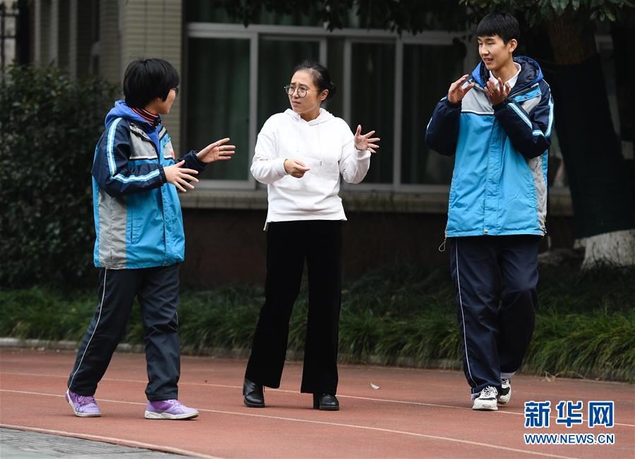 3月4日,在南京市聋人学校,于晓岚在操场上跟学生谈心。 新华社记者季春鹏摄
