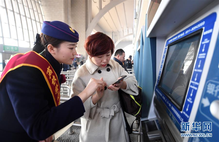 3月5日,在石家庄站售票厅,中国铁路北京局集团有限公司京铁列服公司石家庄分公司高铁餐吧部的工作人员在帮助旅客买票。