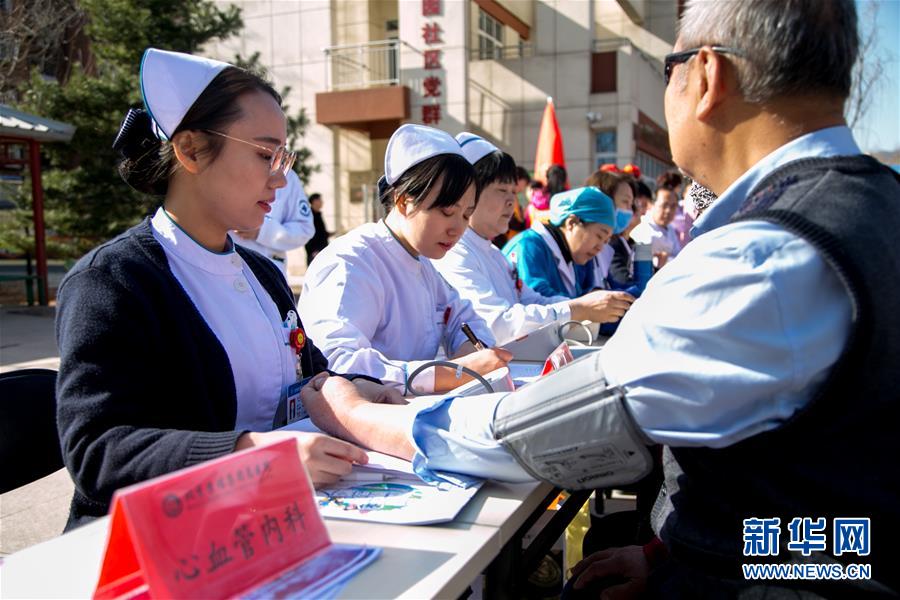 3月5日,在北京市门头沟区大峪街道,医疗志愿者为市民义诊。当日是第56个学雷锋纪念日,全国各地开展形式多样的志愿服务活动,用行动弘扬“雷锋精神”。新华社发(侯继庆 摄)