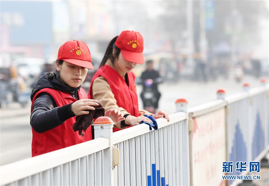 3月5日,在河北省内丘县胜利路,志愿者在擦拭栏杆。当日是第56个学雷锋纪念日,全国各地开展形式多样的志愿服务活动,用行动弘扬“雷锋精神”。新华社发(石晓鹏 摄)