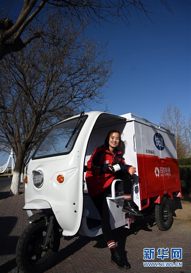 3月5日,快递员高静坐在快递三轮车上留影。新华社记者金良快摄