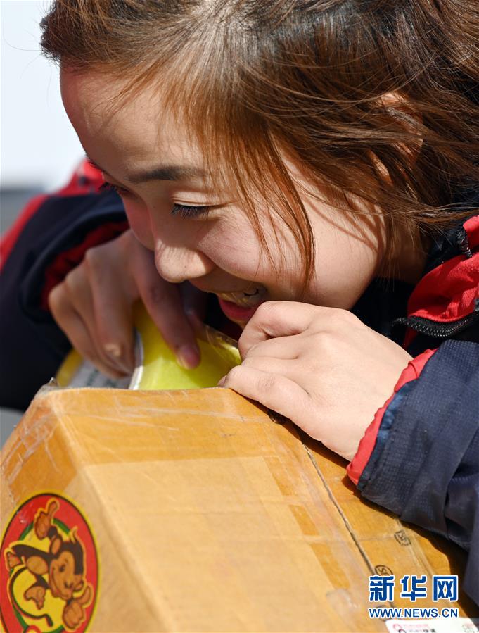 3月5日,快递员高静打包上门取件的包裹。新华社记者金良快摄