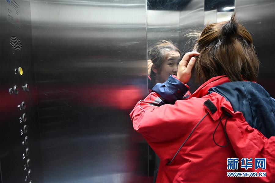3月5日,快递员高静在电梯内照镜子。 新华社记者金良快摄