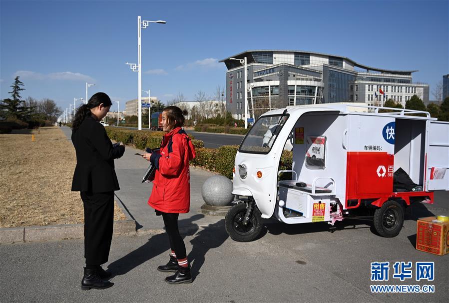 3月5日,快递员高静(右)在北京某单位门口取件。新华社记者金良快摄